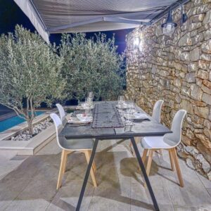 Nieruchomość zbudowana jest z najwyższej jakości materiałów, z ogrzewaniem podłogowym, a luksusowe meble idealnie komponują się z wnętrzem. Z salonu wychodzi się na dziedziniec z basenem i ogrodem z roślinnością śródziemnomorską (oliwki, cytryny, limonki, pomarańcze…).