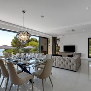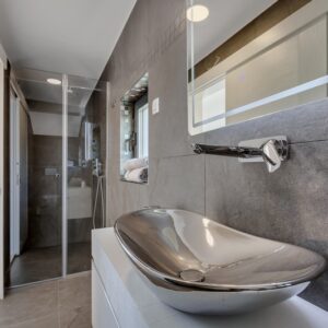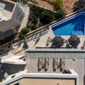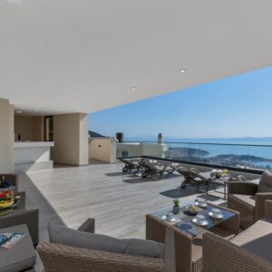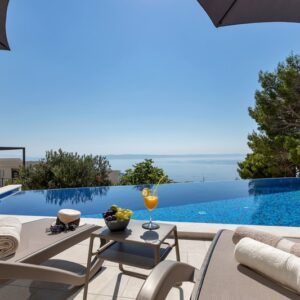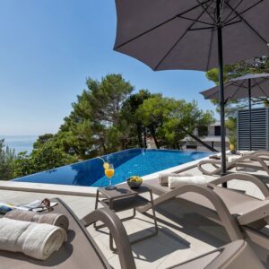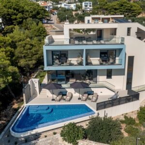 Makarska, dzielnica Veliko brdo, atrakcyjna nowo wybudowana nowoczesna willa z basenem i panoramicznym widokiem na morze na sprzedaż. Budynek ma łączną powierzchnię 417,45 m2 i znajduje się na działce o łącznej powierzchni 516 m2. Willa składa się z piwnicy, parteru, antresoli, pierwszego piętra i dwóch przestronnych tarasów na dachu z otwartym widokiem na morze. W piwnicy znajduje się obszerne kino, siłownia, sauna, łazienka, spiżarnia, pralnia oraz dodatkowa przestrzeń, w której znajduje się system ogrzewania. Na parterze znajduje się garaż na dwa samochody, hol wejściowy, przestronna kuchnia z jadalnią, salon z kominkiem, łazienka dla gości oraz schowek. W południowej części salonu i jadalni znajdują się przeszklone ściany, dzięki którym wnętrze budynku staje się wyjątkowym miejscem z zewnętrznym tarasem południowym, na którym znajduje się basen o powierzchni 40m2 z tarasem do opalania. Z tego piętra można wyjść na taras północny, na którym znajduje się kominek z jadalnią. Wewnętrzne schody z kamienia i balustrady ze stali nierdzewnej prowadzą na antresolę, gdzie znajduje się sypialnia z łazienką, garderobą i balkonem wschodnim oraz na piętro, gdzie znajdują się dwie przestronne sypialnie z łazienkami i garderobą. Pokoje posiadają balkony od strony południowej o powierzchni 9,54 m2 z balustradami z barwionego szkła. Na ostatnim piętrze znajdują się dwa tarasy na dachu, na większym o powierzchni 94,63 m2, który jest w większości zadaszony, jest mniejsza kuchnia z barem i jacuzzi na świeżym powietrzu. Zewnętrzne schody prowadzą na mniejszy taras wschodni o powierzchni 34,60 m2, na którym znajduje się grill na świeżym powietrzu. Cały obiekt wyposażony jest w system grzewczo-chłodzący, sam sprzęt wykorzystuje najwyższej jakości materiały i sprzęt renomowanych producentów. Willa wyposażona jest w wysokiej jakości meble. W otoczeniu willi dominuje śródziemnomorska roślinność. Od strony wschodniej budynku znajdują się dwa miejsca parkingowe.