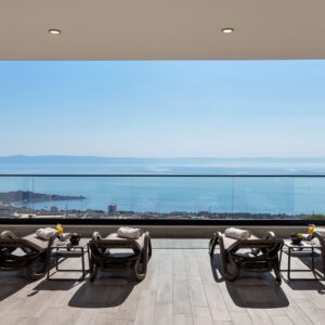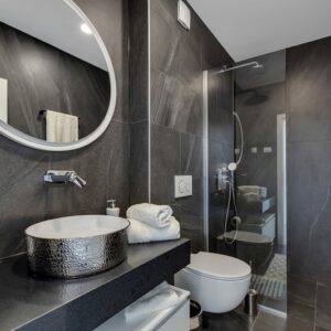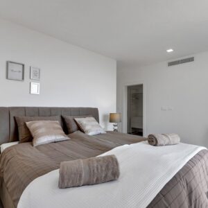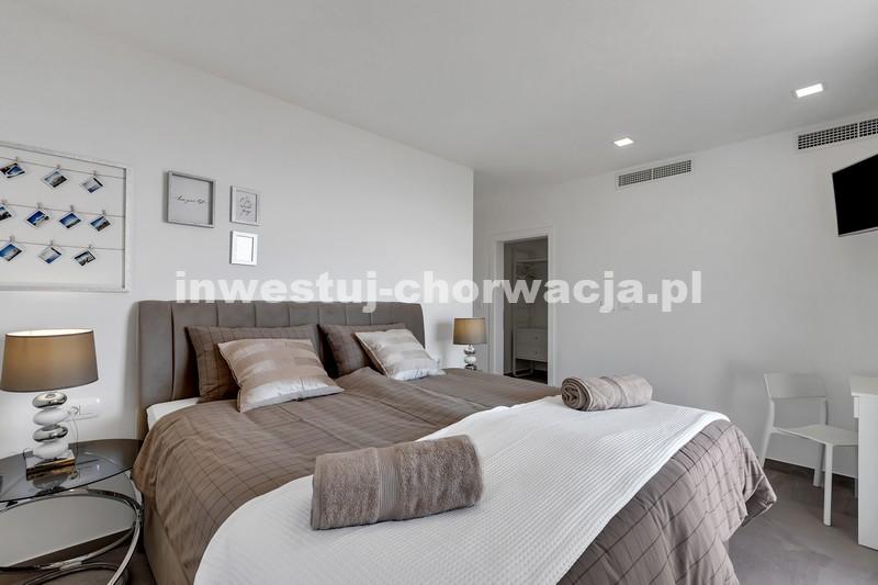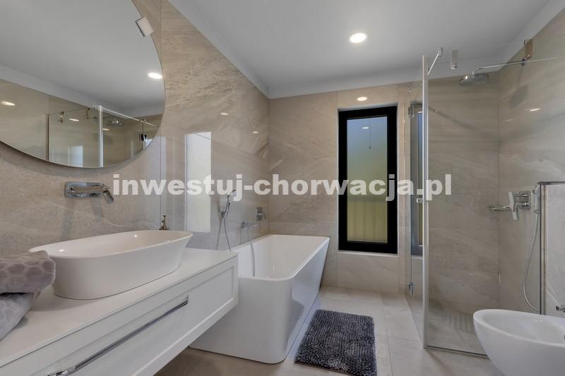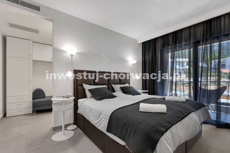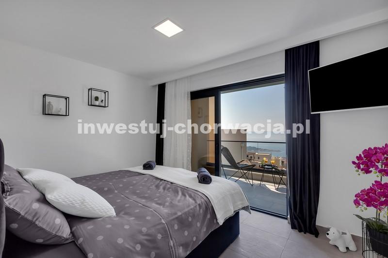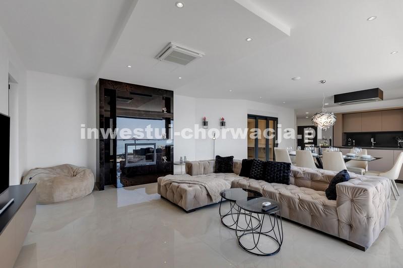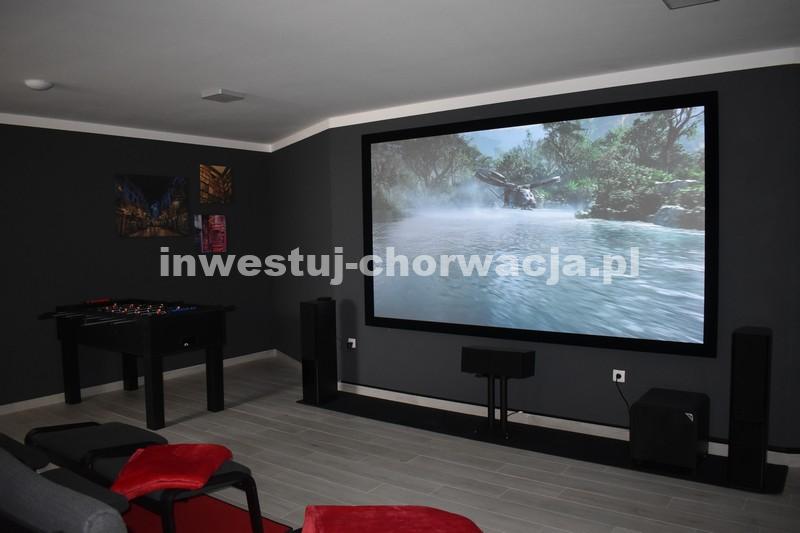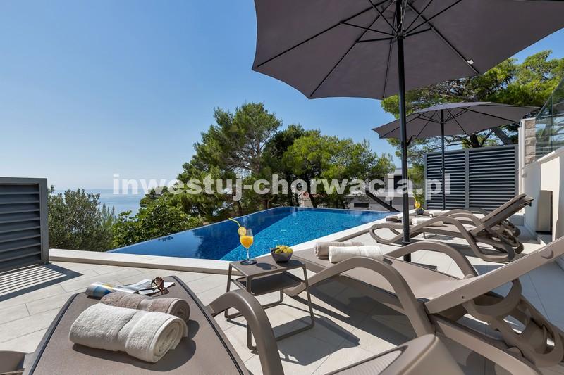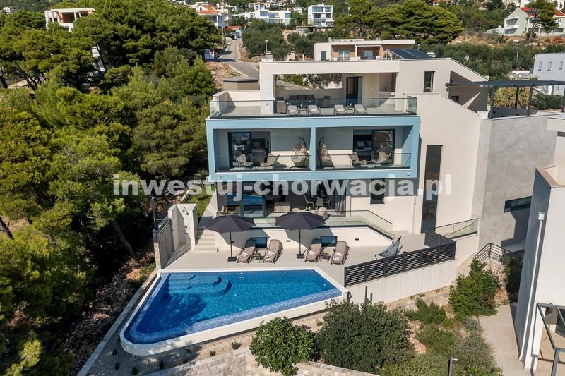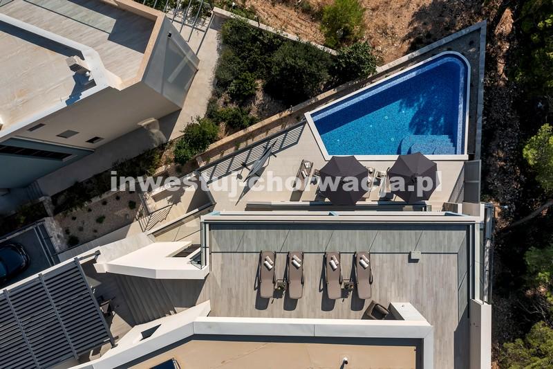 Makarska, dzielnica Veliko brdo, atrakcyjna nowo wybudowana nowoczesna willa z basenem i panoramicznym widokiem na morze na sprzedaż. Budynek ma łączną powierzchnię 417,45 m2 i znajduje się na działce o łącznej powierzchni 516 m2. Willa składa się z piwnicy, parteru, antresoli, pierwszego piętra i dwóch przestronnych tarasów na dachu z otwartym widokiem na morze. W piwnicy znajduje się obszerne kino, siłownia, sauna, łazienka, spiżarnia, pralnia oraz dodatkowa przestrzeń, w której znajduje się system ogrzewania. Na parterze znajduje się garaż na dwa samochody, hol wejściowy, przestronna kuchnia z jadalnią, salon z kominkiem, łazienka dla gości oraz schowek. W południowej części salonu i jadalni znajdują się przeszklone ściany, dzięki którym wnętrze budynku staje się wyjątkowym miejscem z zewnętrznym tarasem południowym, na którym znajduje się basen o powierzchni 40m2 z tarasem do opalania. Z tego piętra można wyjść na taras północny, na którym znajduje się kominek z jadalnią. Wewnętrzne schody z kamienia i balustrady ze stali nierdzewnej prowadzą na antresolę, gdzie znajduje się sypialnia z łazienką, garderobą i balkonem wschodnim oraz na piętro, gdzie znajdują się dwie przestronne sypialnie z łazienkami i garderobą. Pokoje posiadają balkony od strony południowej o powierzchni 9,54 m2 z balustradami z barwionego szkła. Na ostatnim piętrze znajdują się dwa tarasy na dachu, na większym o powierzchni 94,63 m2, który jest w większości zadaszony, jest mniejsza kuchnia z barem i jacuzzi na świeżym powietrzu. Zewnętrzne schody prowadzą na mniejszy taras wschodni o powierzchni 34,60 m2, na którym znajduje się grill na świeżym powietrzu. Cały obiekt wyposażony jest w system grzewczo-chłodzący, sam sprzęt wykorzystuje najwyższej jakości materiały i sprzęt renomowanych producentów. Willa wyposażona jest w wysokiej jakości meble. W otoczeniu willi dominuje śródziemnomorska roślinność. Od strony wschodniej budynku znajdują się dwa miejsca parkingowe.