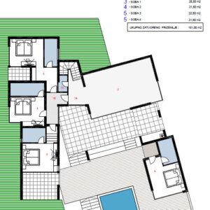 Willa o łącznej powierzchni 151 m2 składa się z przedpokoju, salonu, kuchni z jadalnią, łazienki oraz czterech sypialni. Willa będzie oferować piękny widok na morze.