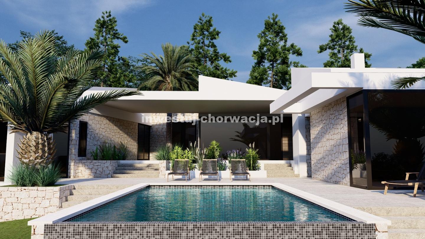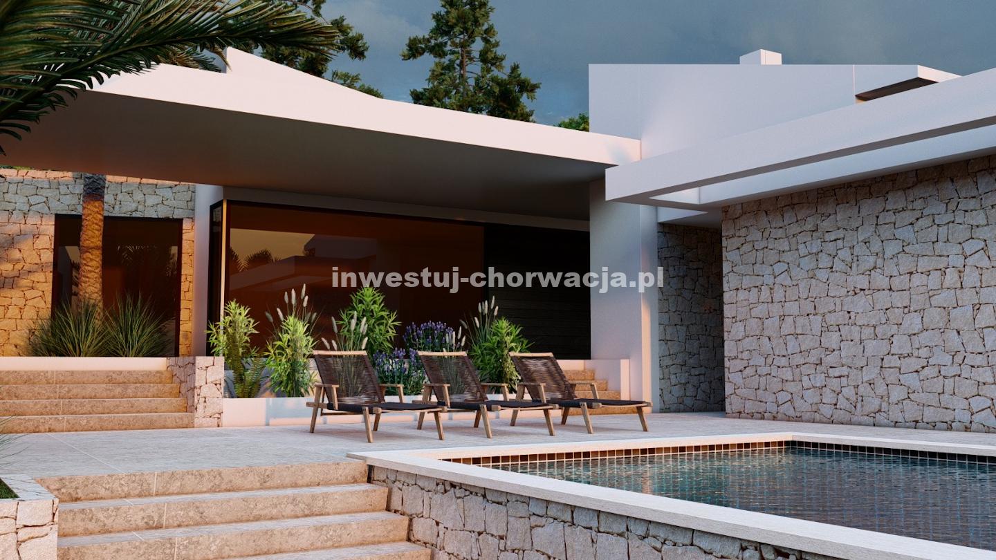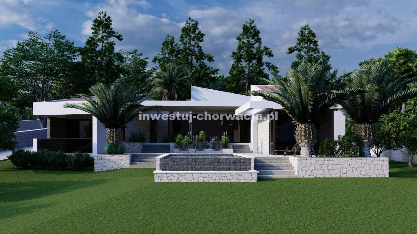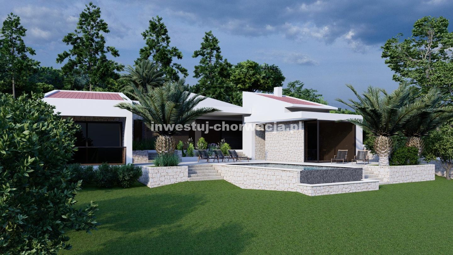 Do sprzedaży oferujemy wyjątkową działkę budowlaną o powierzchni 10.000 m2 wraz z projektem budowy nowoczesnej willi z basenem w Novalji, w pobliżu Camp Paradiso.