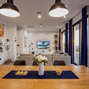 Na parterze domu znajduje się nowoczesna kuchnia typu open-concept z jadalnią i salonem, który prowadzi na taras i basen. Schody prowadzą na pierwsze piętro, gdzie znajdują się 4 sypialnie, każda z własną łazienką.