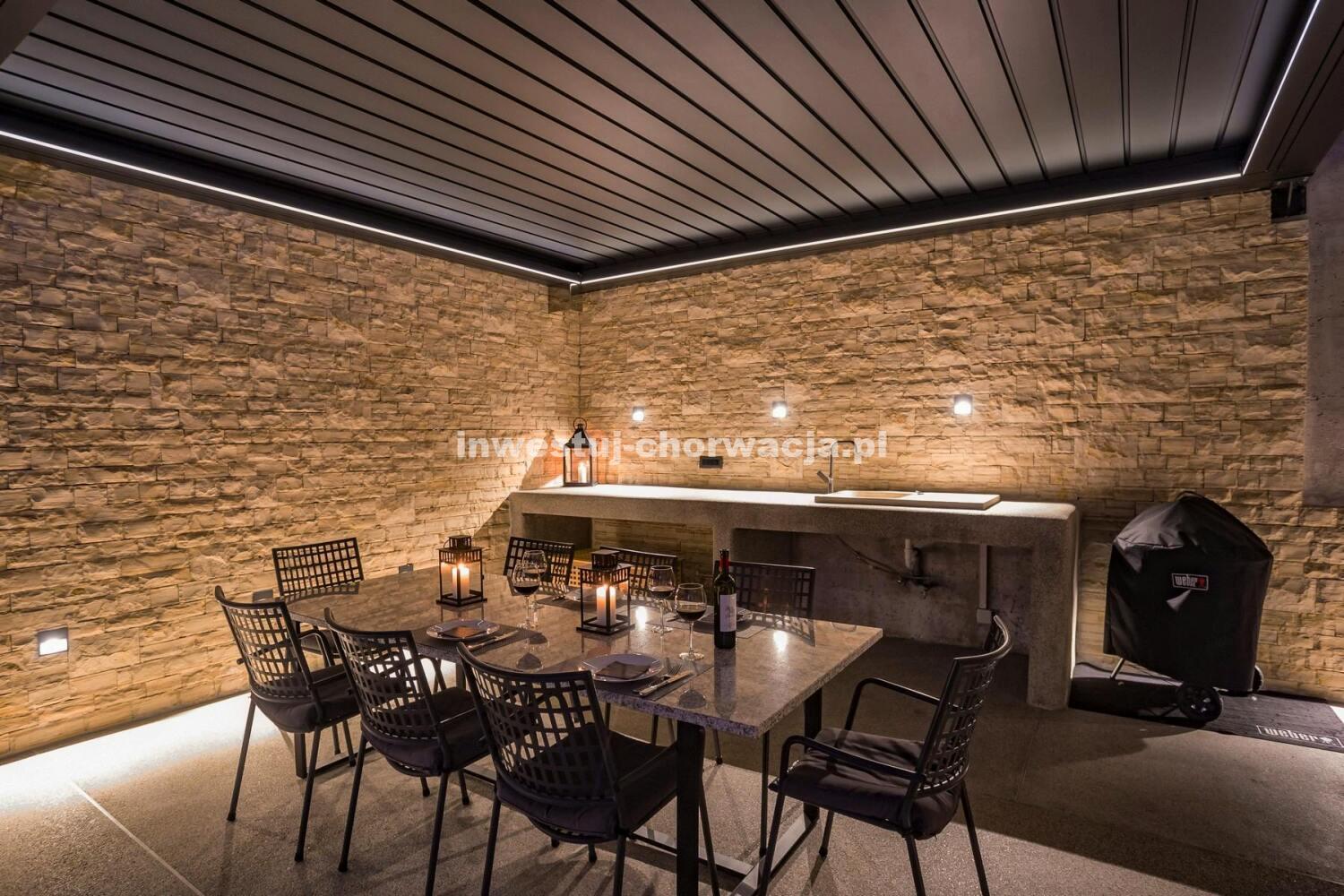 Na parterze domu znajduje się nowoczesna kuchnia typu open-concept z jadalnią i salonem, który prowadzi na taras i basen. Schody prowadzą na pierwsze piętro, gdzie znajdują się 4 sypialnie, każda z własną łazienką.