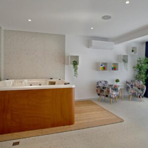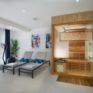 W piwnicy domu znajduje się przestrzeń do wypoczynku i rozrywki, na którą składa się sauna, jacuzzi, sala kinowa i winiarnia.